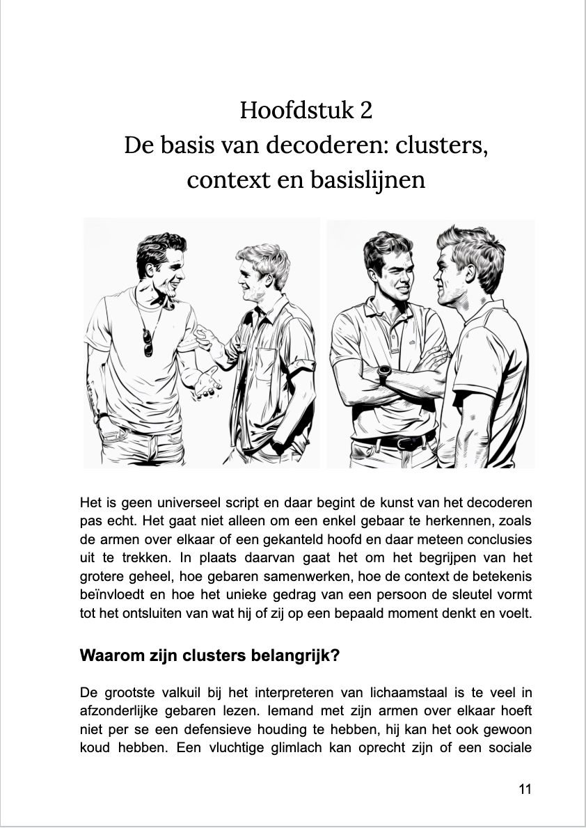 Dit is geen psychologiecursus — en geen YouTube-lijstje met "12 geheime lichaamstaaltrucs." Vanaf pagina één lees je echte mensen in echte gesprekken. Je hebt geen psychologiediploma nodig. Je hoeft niet charismatisch te zijn. Je hebt alleen dit heldere, visuele systeem nodig dat je laat zien waar je op moet letten—en wat het werkelijk betekent in momenten die er echt toe doen.