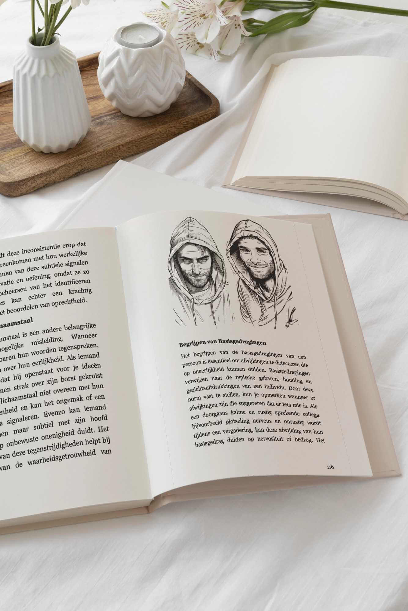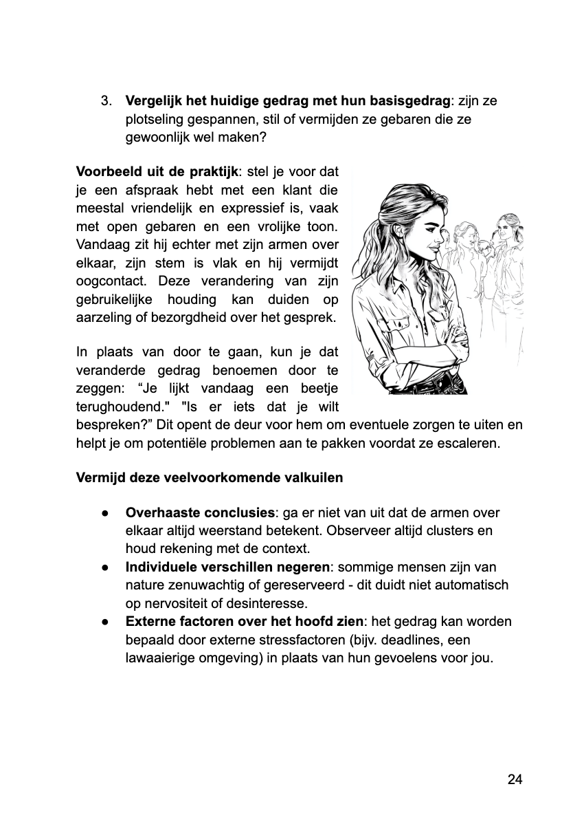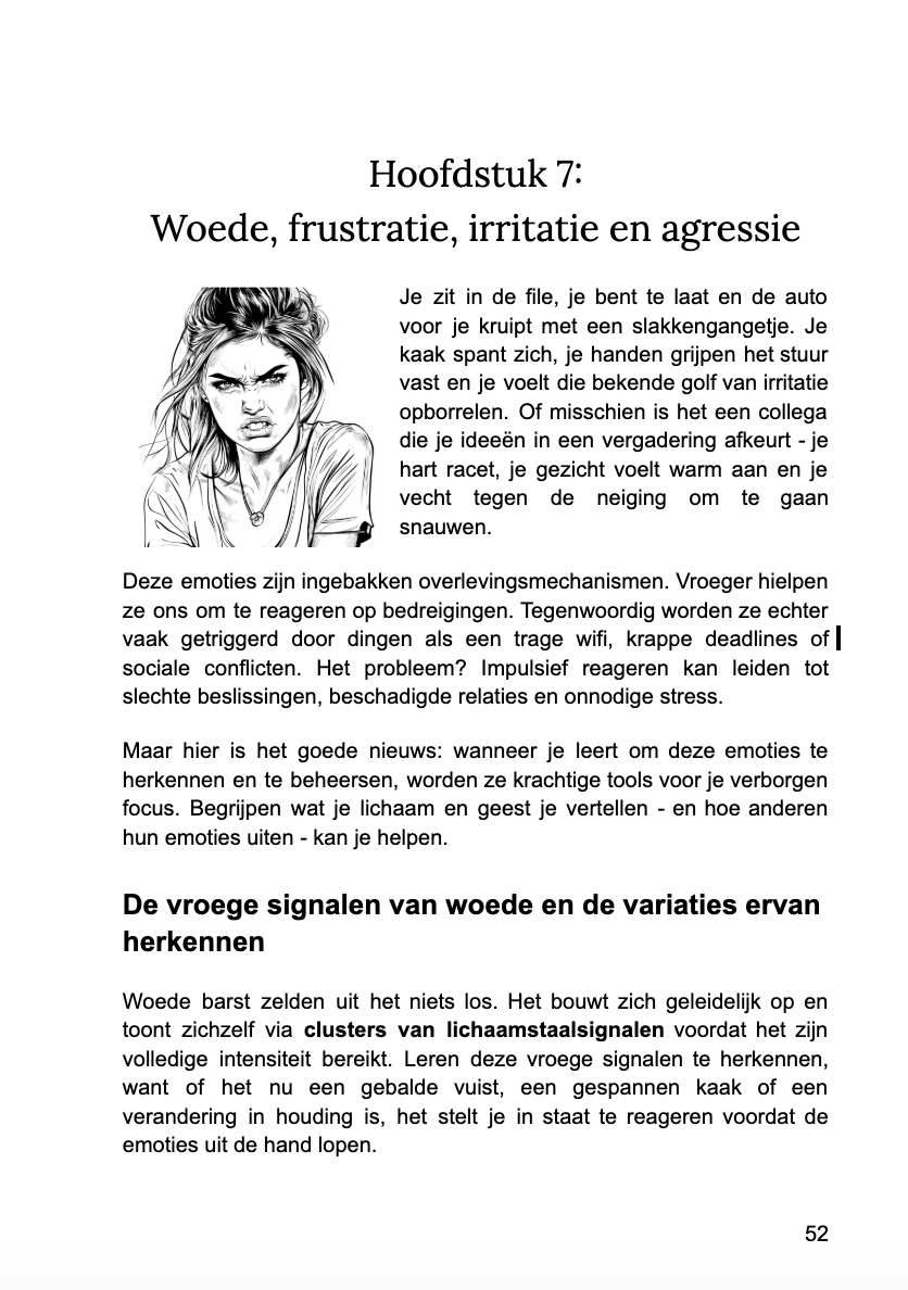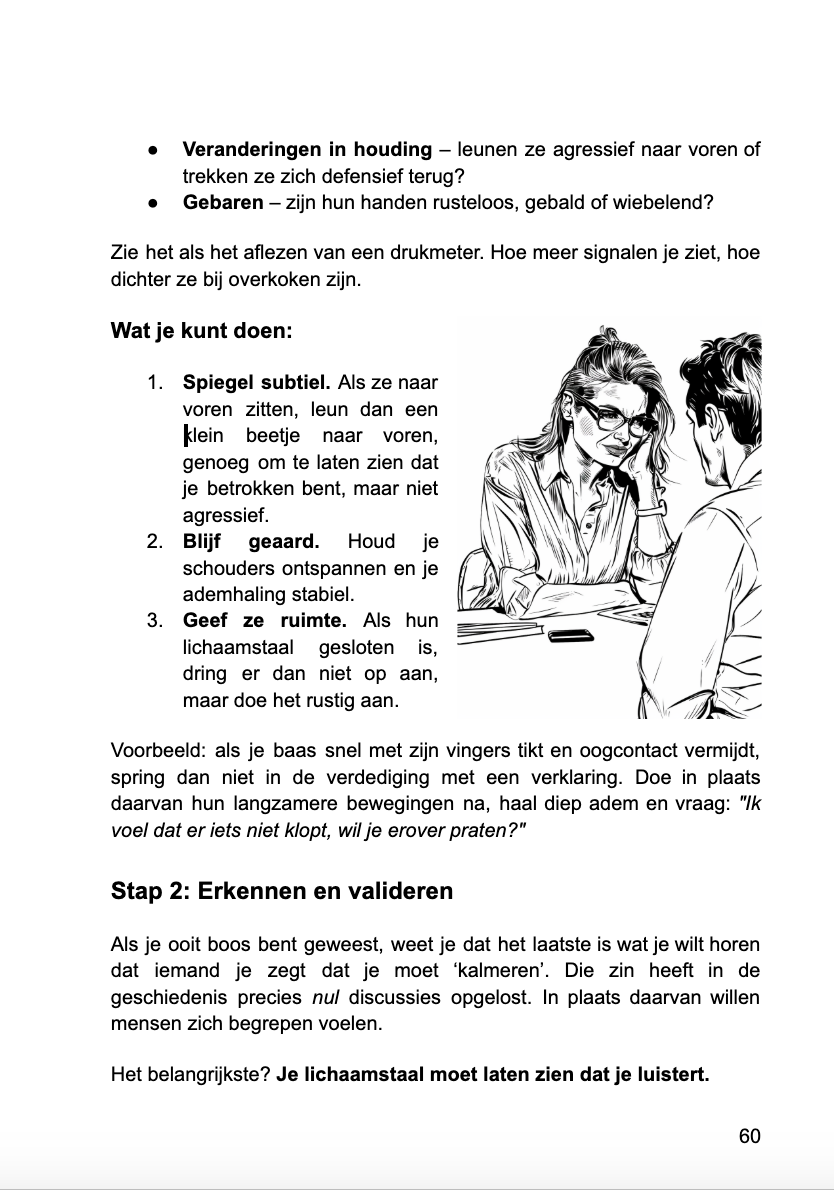 Dit is geen psychologiecursus — en geen YouTube-lijstje met "12 geheime lichaamstaaltrucs." Vanaf pagina één lees je echte mensen in echte gesprekken. Je hebt geen psychologiediploma nodig. Je hoeft niet charismatisch te zijn. Je hebt alleen dit heldere, visuele systeem nodig dat je laat zien waar je op moet letten—en wat het werkelijk betekent in momenten die er echt toe doen.